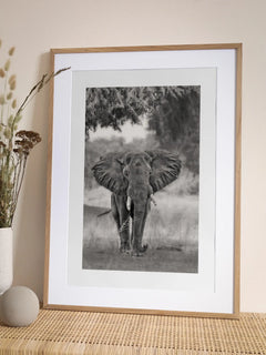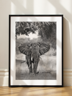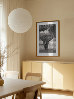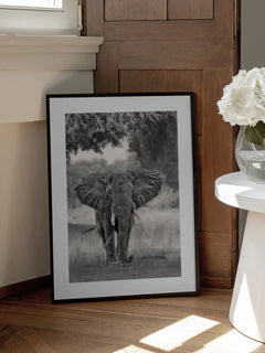 Schwarz-weiß-Fotografie eines Elefanten in der Wildnis. Dieses majestätische Tier bringt einen Hauch von Eleganz an deine Wände und ist perfekt für ein Wohnzimmer!