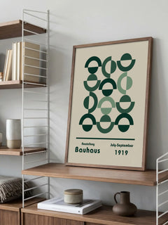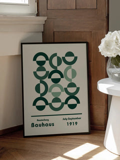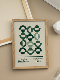 Diese grafische Illustration zeigt Kreise und Halbkreise in verschiedenen Grüntönen auf einem beigen Hintergrund. Am unteren Rand befindet sich der Text "Ausstellung Bauhaus July-September 1919". Dieses Kunstwerk im Retro-Look bringt einen einzigartigen Stil in dein Zuhause und ist ein perfektes Beispiel für Bauhaus-Design.