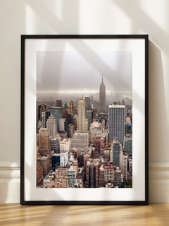 Druck einer Fotografie von New York City mit Wolkenkratzern und dem Empire State Building vor einem grauen Himmel. Füge dieses Motiv zu deiner Bilderwand hinzu, um einen urbanen, modernen Look zu kreieren.