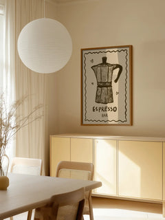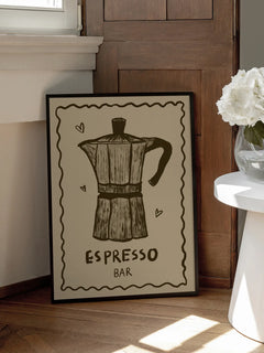 Dieses Poster zeigt eine stilvolle Illustration einer klassischen Espressokanne in Schwarz auf einem beigen Hintergrund. Unter der Kanne steht der Text "Espresso Bar" in einer handgezeichneten Schrift. Kleine Herzsymbole umrahmen die Kanne und verleihen dem Bild eine charmante Note. Dieses Kunstwerk ist ideal für Kaffeeliebhaber und eignet sich perfekt als dekoratives Element in der Küche oder im Essbereich.