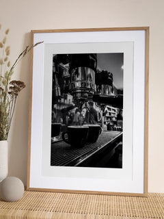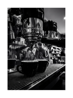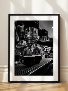 Dieses Poster zeigt eine stilvolle Schwarz-Weiß-Fotografie einer Espressomaschine in Aktion. Der Fokus liegt auf dem Moment, in dem der Espresso in zwei schwarze Tassen fließt, was die Kunst des Kaffeebrühens eindrucksvoll einfängt. Der Hintergrund zeigt unscharf ein Café-Interieur, das eine gemütliche und einladende Atmosphäre vermittelt. Perfekt für Kaffeeliebhaber und als Dekoration für Küchen oder Cafés geeignet.