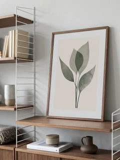 Diese grafische Illustration zeigt Blätter in verschiedenen Grüntönen mit einem Aquarelleffekt auf einem hellbeigen Hintergrund. Die sanften Übergänge und die natürliche Form der Blätter verleihen dem Bild eine beruhigende und moderne Ausstrahlung. Perfekt, um jedem Raum einen frischen und stilvollen Akzent zu verleihen.