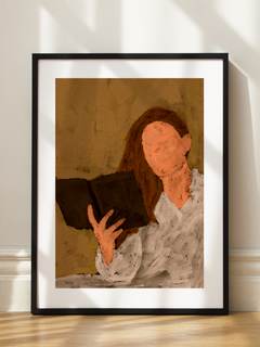 Dieses Bild zeigt eine Frau in einem weißen Kleid, die in ein Buch vertieft ist. Der Hintergrund ist in einem sanften Beige gehalten, was der Szene eine ruhige und kontemplative Atmosphäre verleiht. Die Gesichtszüge der Frau sind absichtlich weggelassen, was dem Betrachter Raum für Interpretation und Vorstellungskraft lässt. Diese Malerei fängt die stille Freude des Lesens ein und ist eine Hommage an die Welt der Bücher.