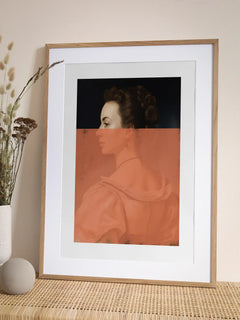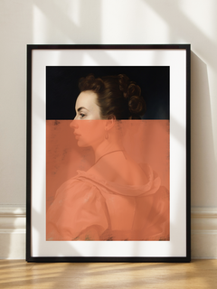 Dieses moderne Poster zeigt eine elegante Frau in einem weichen, rosafarbenen Kleid, das mit einem auffälligen orangefarbenen Pinselstrich überlagert ist. Die Kombination aus klassischem Porträt und abstrakter Kunst schafft eine faszinierende Spannung und verleiht dem Bild eine einzigartige, zeitgenössische Note. Perfekt für moderne Wohnräume, die einen Hauch von Eleganz und Kreativität suchen.