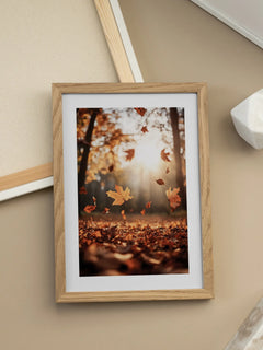 Diese Fotografie zeigt herabfallende, orangefarbene Herbstblätter, die sanft durch die Luft schweben. Im Hintergrund sind die Sonne und Bäume zu sehen, die eine warme und einladende Herbststimmung erzeugen. Dieses Bild bringt die Schönheit der herbstlichen Natur direkt in dein Zuhause und schafft eine gemütliche Atmosphäre.
