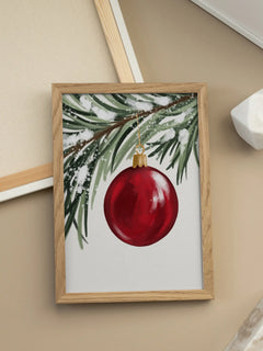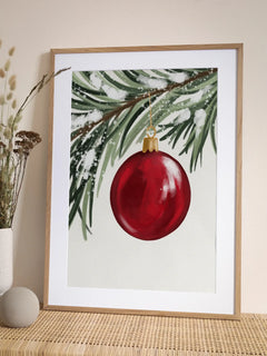 Diese Illustration zeigt eine rote Weihnachtskugel, die an einem schneebedeckten Tannenzweig hängt. Die festliche Farbpalette und das klassische Motiv machen dieses Poster zur perfekten Wahl für deine Weihnachtsdekoration. Es bringt eine warme und einladende Atmosphäre in jeden Raum und fängt die Essenz der Weihnachtszeit ein.