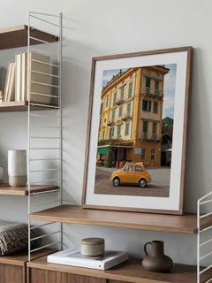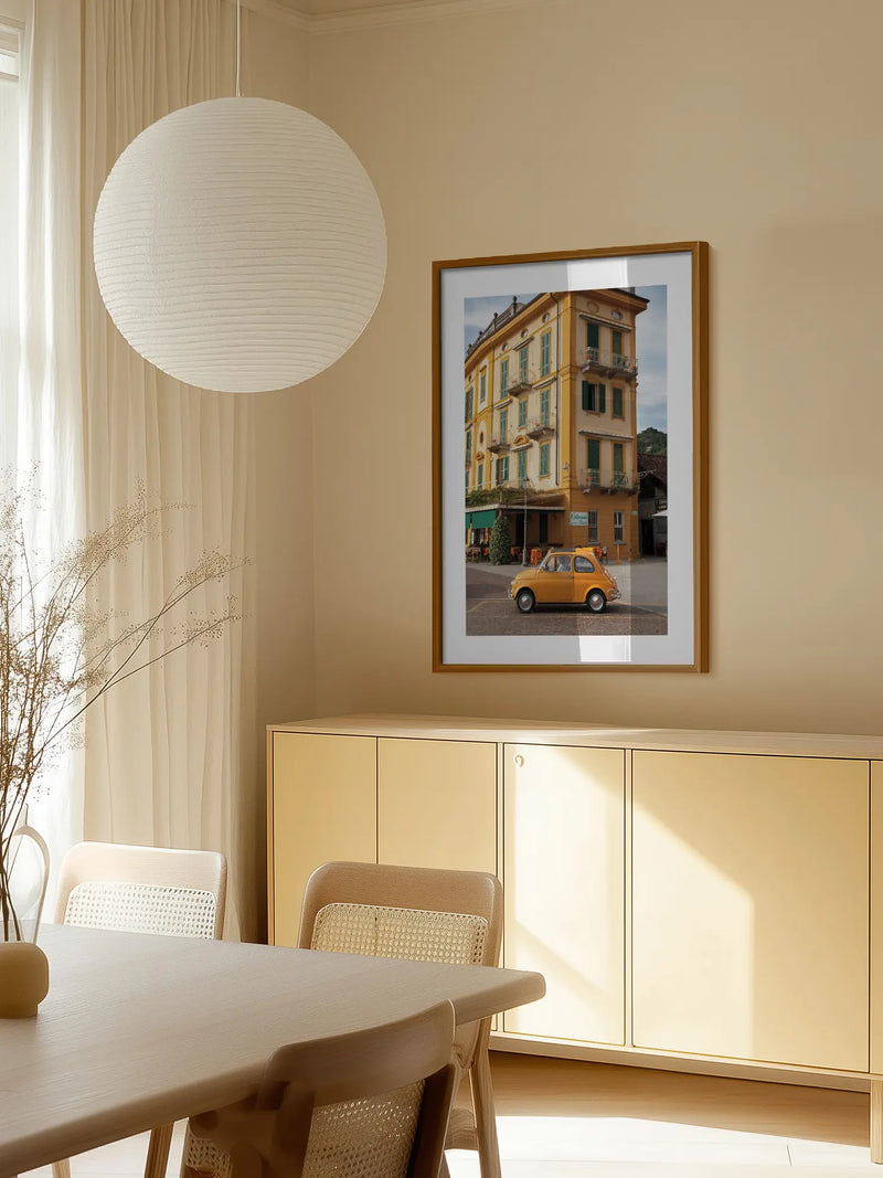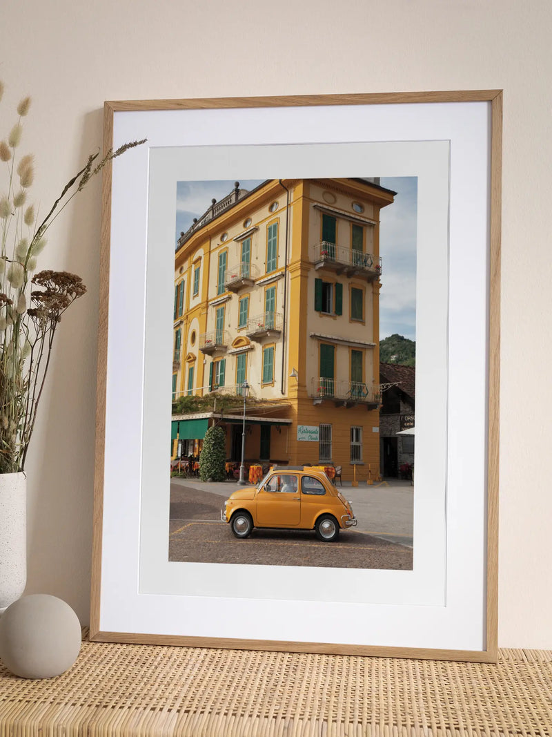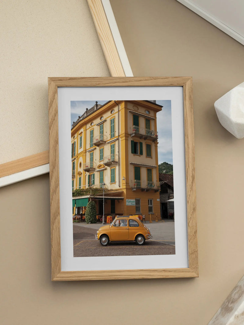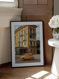 Ein charmantes Vintage-Auto steht vor einem gelben Gebäude mit grünen Fensterläden. Die Szene strahlt eine nostalgische Atmosphäre aus und ist ideal für Autoliebhaber und Fans von Retro-Designs. Das Bild fängt die Essenz eines sonnigen Tages in einer malerischen Stadt ein und verleiht jedem Raum einen Hauch von klassischem Stil.