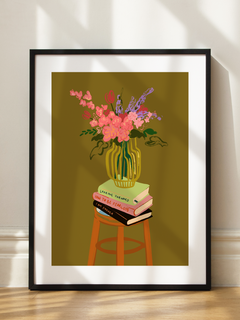 Dieses charmante Poster zeigt einen Blumenstrauß in einer Vase, der auf einem Stapel Bücher auf einem Hocker arrangiert ist. Die warmen Farben und die liebevolle Darstellung schaffen eine gemütliche Atmosphäre, die perfekt für Wohn- oder Schlafzimmer geeignet ist. Die Bücher tragen inspirierende Titel wie „Looking Forward“, „How to Be Fearless“ und „I Am Enough“, die eine positive und motivierende Botschaft vermitteln.