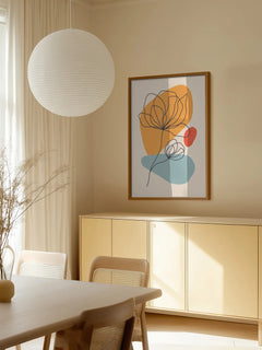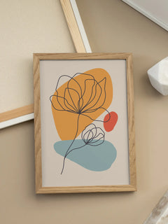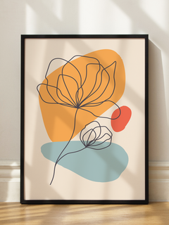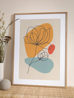 Dieses Poster zeigt eine minimalistische Blumenzeichnung in Linien, kombiniert mit einem orangefarbenen Kreis und einer blauen Form. Die abstrakte Komposition verleiht dem Bild eine moderne und künstlerische Note, die sich perfekt in zeitgenössische Wohnräume einfügt.