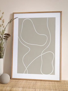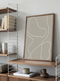 Dieses Poster zeigt eine grafische Illustration mit geschwungenen weißen Linien und Formen auf einem beigen Hintergrund. Die neutralen Farben und das minimalistische Design machen es zu einer idealen Ergänzung für moderne Wohnräume. Es strahlt Ruhe und Eleganz aus und fügt sich harmonisch in eine Vielzahl von Einrichtungsstilen ein.