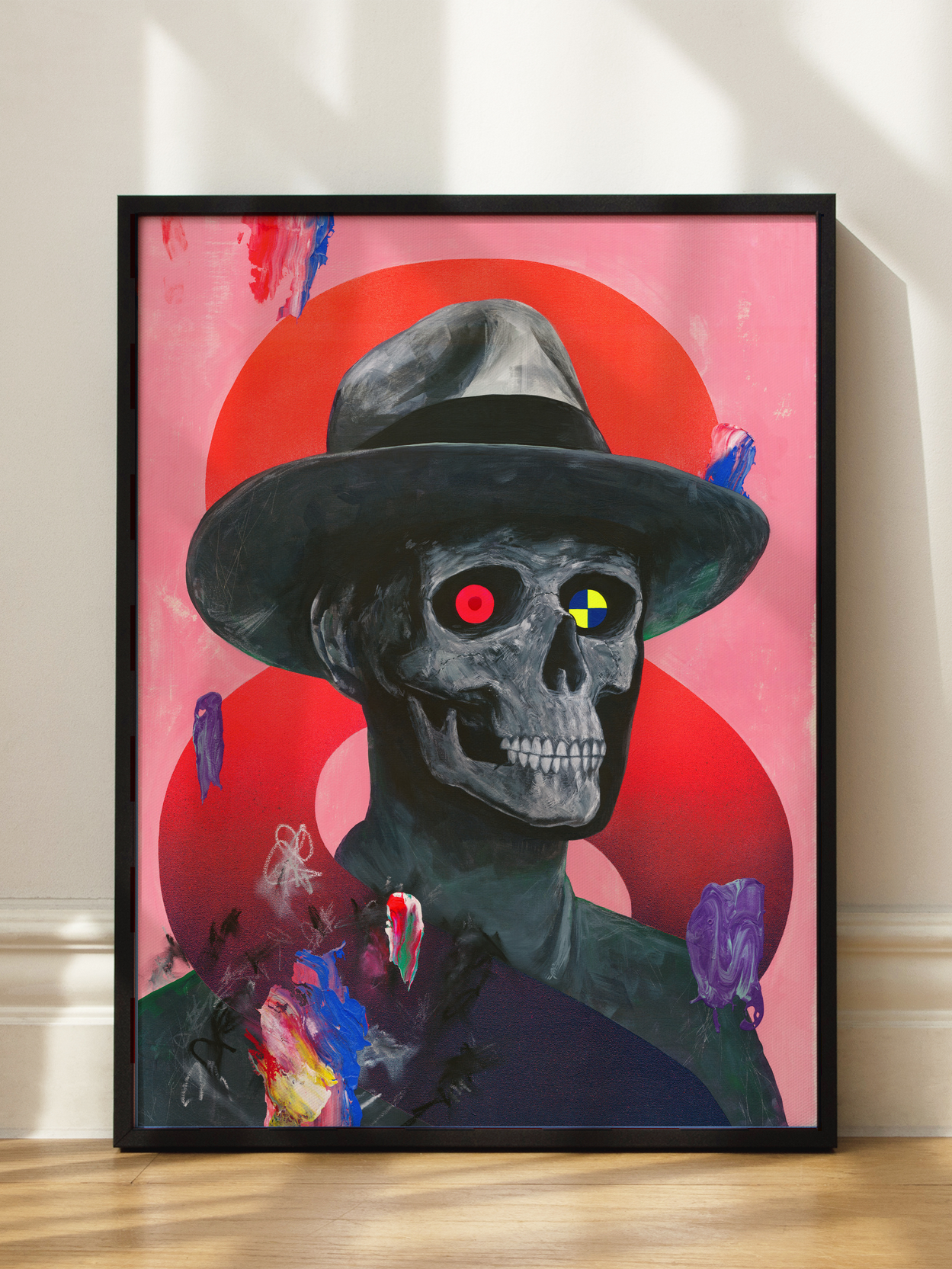 Ein Totenkopf mit einem Auge in Rot und Gelb/Blau, das einen Hut vor einem rot/pinken Hintergrund trägt. Dieses originelle Poster wird sicher zum Hingucker in deinem Zuhause! Die kontrastreichen Farben und das skurrile Design verleihen dem Bild eine einzigartige und auffällige Ästhetik.
