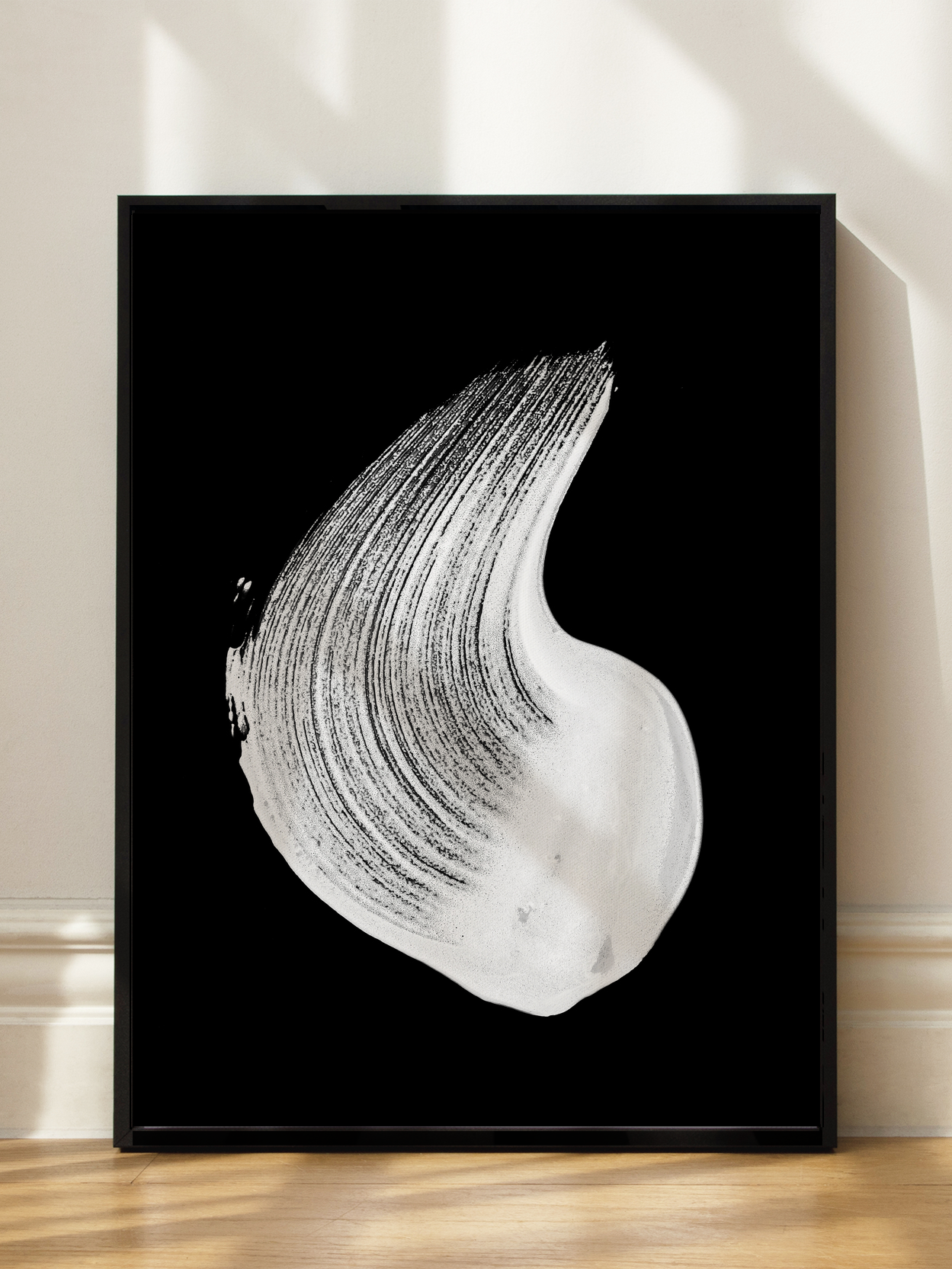Ein elegantes Poster mit einem weißen Pinselstrich auf tiefschwarzem Hintergrund. Diese monochrome Komposition strahlt eine zeitlose Ästhetik aus, die sich perfekt in jede Einrichtung einfügt. Die kontrastreiche Darstellung von Schwarz und Weiß verleiht dem Bild eine moderne und zugleich klassische Note, ideal für Liebhaber minimalistischer Kunst.