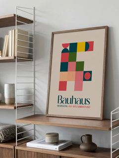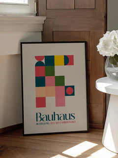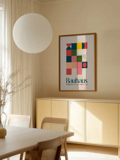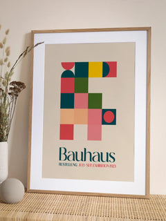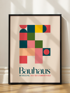 Ein Poster mit geometrischen Formen in leuchtenden Farben und dem Text "Bauhaus Ausstellung July-Sep. Exhibition 1923" in Schwarz und Rot. Der Hintergrund ist hellbeige. Ein perfektes Poster für Kunstliebhaber und Fans von Bauhaus-Design.