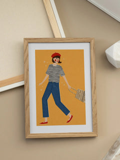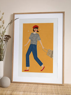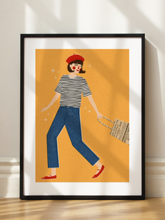 Dieses Poster zeigt eine stilvolle Frau in einem gestreiften Oberteil, blauer Hose und einer roten Baskenmütze. Sie trägt eine Tasche mit Zeitungsausschnitten und steht vor einem lebendigen orangefarbenen Hintergrund. Die Illustration strahlt französischen Chic und Eleganz aus und ist perfekt, um jedem Raum einen Hauch von Stil zu verleihen.