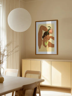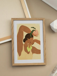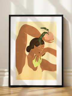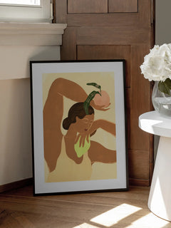 Eine stilisierte Frau hält einen Pfirsich in warmen Beigetönen. Das minimalistische Design funktioniert besonders gut in der Küche oder über dem Esstisch. Die organischen Formen ergänzen moderne Einrichtung mit natürlichen Akzenten.