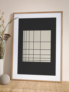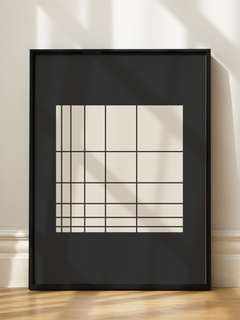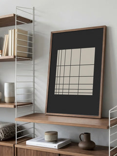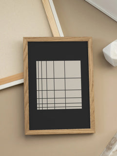 Dieses Poster zeigt ein minimalistisches Design mit einem beigen Quadrat, das in der Ecke ein schwarzes Raster enthält. Der Hintergrund ist dunkelgrau, was einen starken Kontrast zum hellen Quadrat bildet. Das geometrische Muster verleiht dem Bild eine moderne und strukturierte Ästhetik, die sich perfekt in ein zeitgenössisches Interieur einfügt.