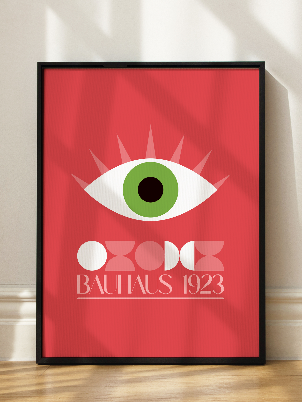 Diese Grafik zeigt ein stilisiertes grünes Auge mit einem schwarzen Kreis in der Mitte, platziert auf einem kräftigen roten Hintergrund. Darunter steht der Text "Bauhaus 1923" in einer modernen Schriftart. Das Design kombiniert leuchtende Farben und abstrakte Formen, die an den ikonischen Bauhaus-Stil erinnern. Perfekt, um einer modernen Wand einen Hauch von künstlerischer Avantgarde zu verleihen.
