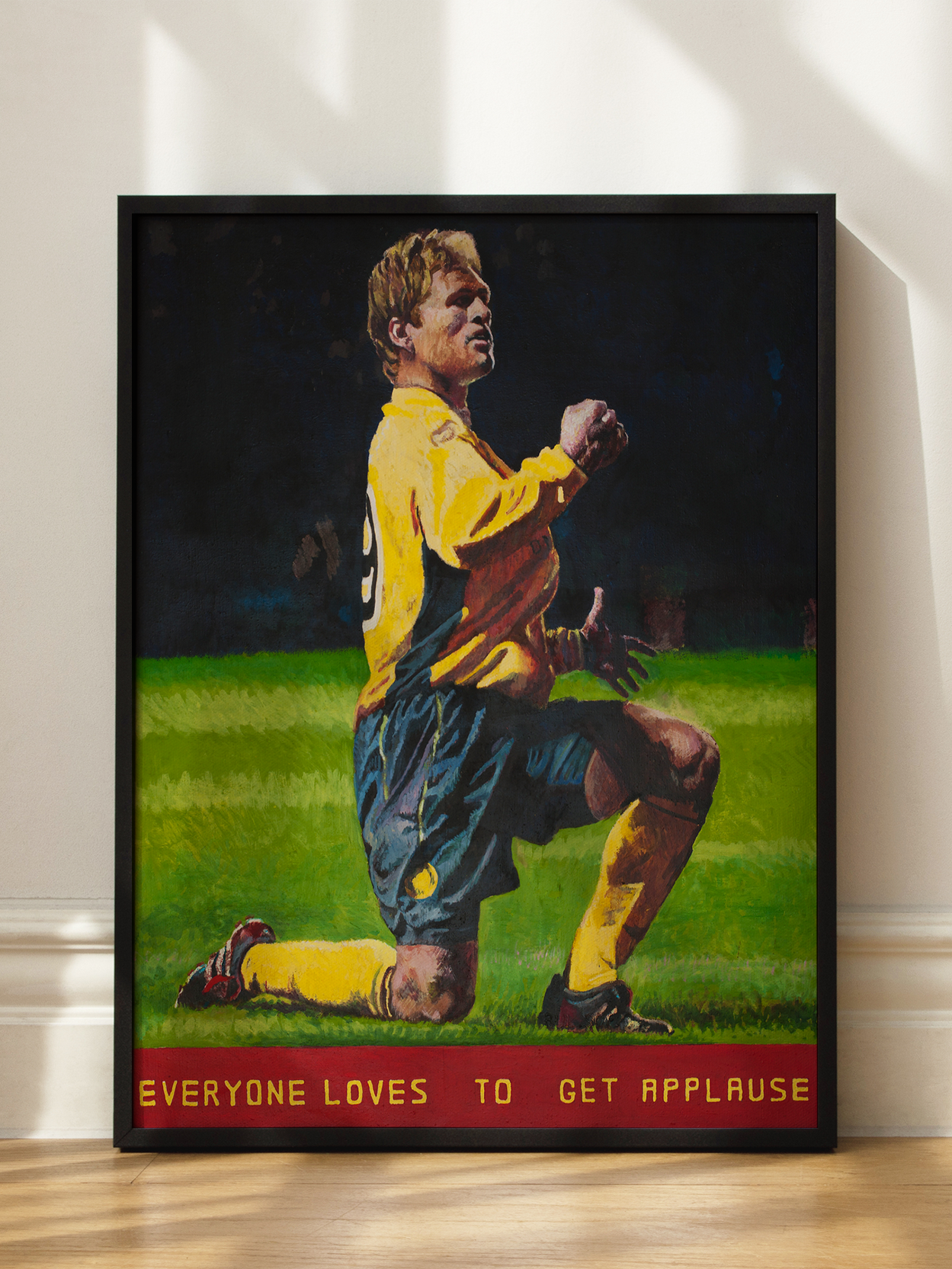 Dieses Poster zeigt einen Fußballspieler in gelber Ausrüstung, der auf dem Rasen kniet. Der Spieler scheint einen Moment des Triumphes oder der Anerkennung zu erleben, was durch den darunter stehenden Text "Everyone loves to get applause" unterstrichen wird. Die Szene vermittelt ein Gefühl von Erfolg und Anerkennung im Sport.