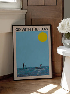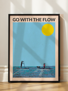 Dieses lebendige Poster zeigt zwei Personen und einen Hund beim Stand-up-Paddling auf einem blauen Meer unter einer strahlend gelben Sonne. Der Text „Go with the Flow“ steht darüber und vermittelt eine entspannte, sommerliche Stimmung. Perfekt, um Farbe und Urlaubsfeeling in dein Zuhause zu bringen!
