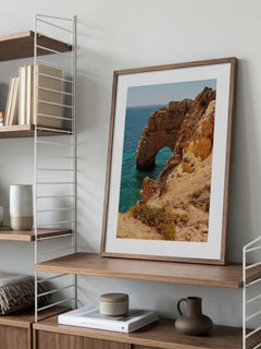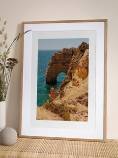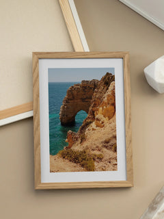 Ein Fotoposter, das die goldene Küste der Algarve zeigt, die von der Sonne angestrahlt wird. Die Wellen schlagen gegen die Klippen und schaffen ein Gefühl von Ruhe und Frieden. Die warmen Töne der Felsen kontrastieren mit dem tiefen Blau des Meeres und fangen die natürliche Schönheit dieser atemberaubenden Landschaft ein. Perfekt für alle, die sich ein Stück Küstenidylle in ihr Zuhause holen möchten.