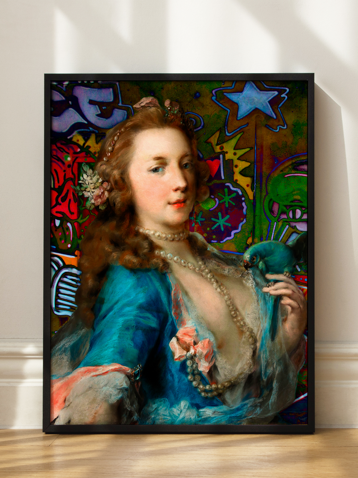 Dieses Poster kombiniert klassisches und modernes Design. Es zeigt eine Frau in einem blauen Kleid mit einem Papagei, was dem Bild eine historische Anmutung verleiht. Der Hintergrund ist ein lebendiges Graffiti, das das Wort "Peace" enthält und moderne Kunst widerspiegelt. Perfekt für alle, die ein einzigartiges und stilvolles Poster suchen.