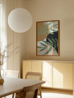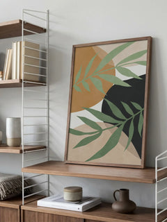 Diese grafische Illustration zeigt grüne Blätter, die vor beigen und schwarzen Formen auf einem weißen Hintergrund platziert sind. Die Kombination aus natürlichen und geometrischen Elementen verleiht dem Bild eine moderne und frische Ausstrahlung. Perfekt, um jedem Raum einen Hauch von Natur und Stil zu verleihen.