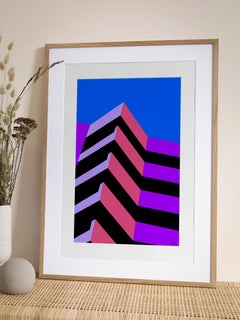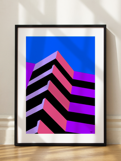 Dieses Poster zeigt eine grafische Illustration eines modernen Gebäudes vor einem klaren blauen Himmel. Die kräftigen Farben und präzisen Linien verleihen dem Bild eine dynamische und zeitgenössische Ausstrahlung. Ideal für Liebhaber moderner Kunst, bringt es einen Hauch von Kreativität und Frische in jedes helle und künstlerische Zuhause.