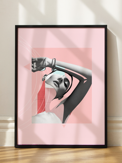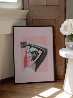 Ein elegant gestaltetes Collagenposter, das eine Frau in Grautönen zeigt, kombiniert mit rosa, grafischen Formen. Die Komposition verbindet klassische Schönheit mit modernen, geometrischen Elementen und schafft so ein harmonisches und stilvolles Kunstwerk. Der Kontrast zwischen den monochromen Tönen und den lebhaften rosa Formen verleiht dem Bild eine dynamische und zugleich beruhigende Wirkung.