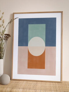 Dieses Poster zeigt eine faszinierende Komposition aus geometrischen Formen in verschiedenen Farben. Die abstrakte Kunst mit ihren klaren Linien und harmonischen Farbtönen verleiht jedem Raum einen modernen und stilvollen Touch. Perfekt, um einen trendigen Look zu gestalten und zeitlose Eleganz in Ihre Einrichtung zu bringen.
