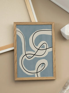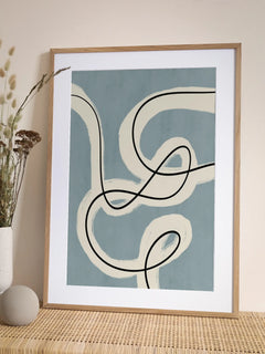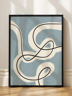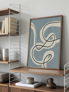 Dieser Druck zeigt eine faszinierende Komposition aus dunkel- und hellblauen Linien, die mit weißen und schwarzen Linien und Punkten kombiniert sind. Das minimalistische Design verleiht dem Bild einen modernen Look, der sich perfekt in ein minimalistisches Zuhause einfügt. Ideal, um jedem Raum eine zeitgemäße Note zu verleihen.