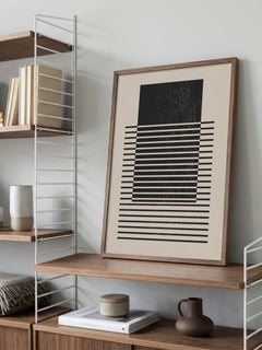 Dieses Poster zeigt eine grafische Illustration mit einem schwarzen Quadrat und horizontalen Streifen auf einem beigen Hintergrund. Die klare Linienführung und das minimalistische Design machen es zu einer idealen Ergänzung für moderne Wohnräume. Es lässt sich hervorragend mit anderen grafischen Postern kombinieren oder als Einzelstück präsentieren, um einen stilvollen Akzent zu setzen.