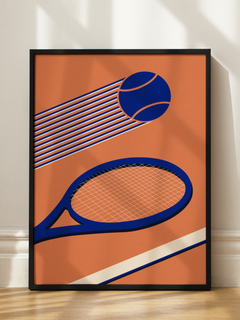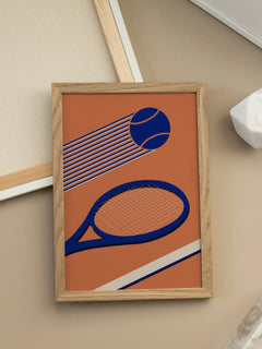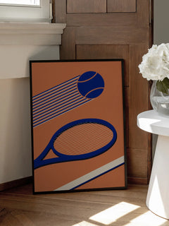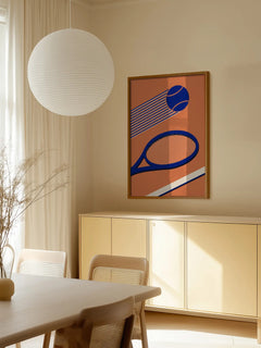 Diese grafische Illustration zeigt einen blauen Tennisschläger und einen Tennisball auf einem lebhaften orangefarbenen Hintergrund. Die dynamische Darstellung des Balls in Bewegung verleiht dem Bild Energie und Schwung. Ein perfektes Poster für alle Tennisliebhaber, das Sportbegeisterung und modernes Design vereint.