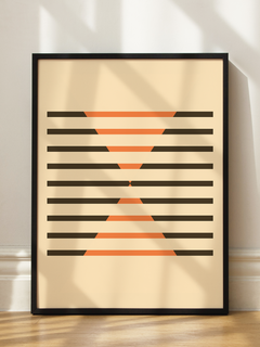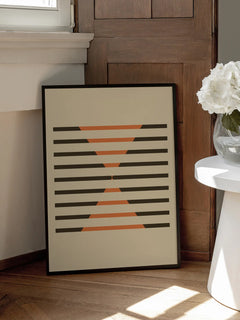 Diese grafische Illustration zeigt ein modernes Design mit schwarzen und orangefarbenen Streifen und Dreiecken auf einem beigen Hintergrund. Die geometrischen Formen und der Kontrast der Farben verleihen dem Bild eine dynamische und zeitgenössische Ausstrahlung. Ideal, um jedem Raum einen modernen und stilvollen Touch zu verleihen.