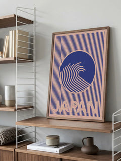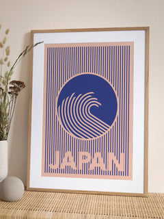 Diese grafische Illustration zeigt eine stilisierte Welle in Blau, die von einem rosa Hintergrund mit vertikalen Linien umgeben ist. Unter der Welle steht der Text "Japan" in großen Buchstaben. Die Komposition ist modern und trendig, mit einem harmonischen Farbspiel, das sowohl beruhigend als auch dynamisch wirkt. Perfekt für Liebhaber von minimalistischen und kulturell inspirierten Designs.