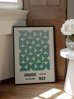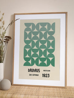 Dieses grafische Poster zeigt ein ikonisches Design der Bauhaus-Ausstellung von 1923. Die geometrischen Formen in verschiedenen Grüntönen auf einem beigen Hintergrund verkörpern den minimalistischen und funktionalen Stil der Bauhaus-Bewegung. Der Text unter den Formen informiert über die Ausstellung, die von Juli bis September stattfand. Ein ideales Kunstwerk für moderne und stilvolle Wohnräume, das die Essenz der Bauhaus-Ära einfängt.
