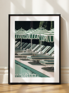 Das Bild zeigt eine stilvolle Poollandschaft mit grünen und weißen Sonnenliegen und Sonnenschirmen. Die harmonische Anordnung der Liegen und Schirme neben dem klaren Wasser des Pools vermittelt ein Gefühl von Entspannung und Sommerfrische. Dieses Poster bringt eine erfrischende und elegante Atmosphäre in jeden Raum und lädt zum Träumen von sonnigen Tagen ein.