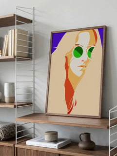 Dieses Poster zeigt eine stilisierte grafische Illustration einer Frau mit langen Haaren, die grüne Sonnenbrillen trägt. Der Hintergrund ist in einem kräftigen Lila gehalten, während die Figur in warmen Beige- und Orangetönen gestaltet ist. Die lebendigen Farben und der moderne Stil machen dieses Kunstwerk zu einem auffälligen Element in jedem Raum und verleihen Ihrem Zuhause eine frische, zeitgemäße Note.