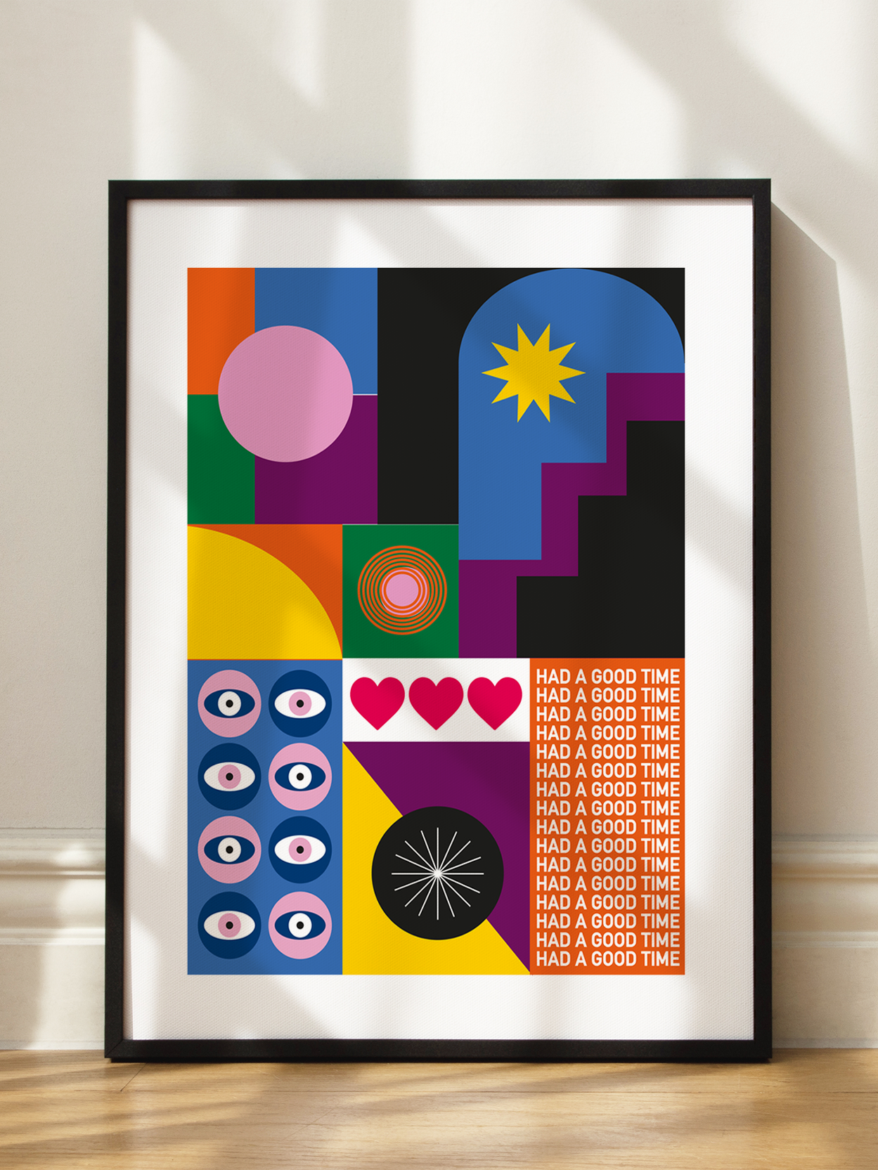Dieses lebendige Poster zeigt eine Vielzahl von geometrischen Formen und leuchtenden Farben, die in einem modernen, grafischen Stil angeordnet sind. Der Satz "Had a good time" wiederholt sich in orangefarbener Schrift auf einem weißen Hintergrund, was dem Design eine spielerische und positive Note verleiht. Die Kombination aus Kreisen, Herzen, Augenmotiven und abstrakten Mustern schafft eine dynamische und energiegeladene Komposition, die ideal für moderne Wohnräume geeignet ist.