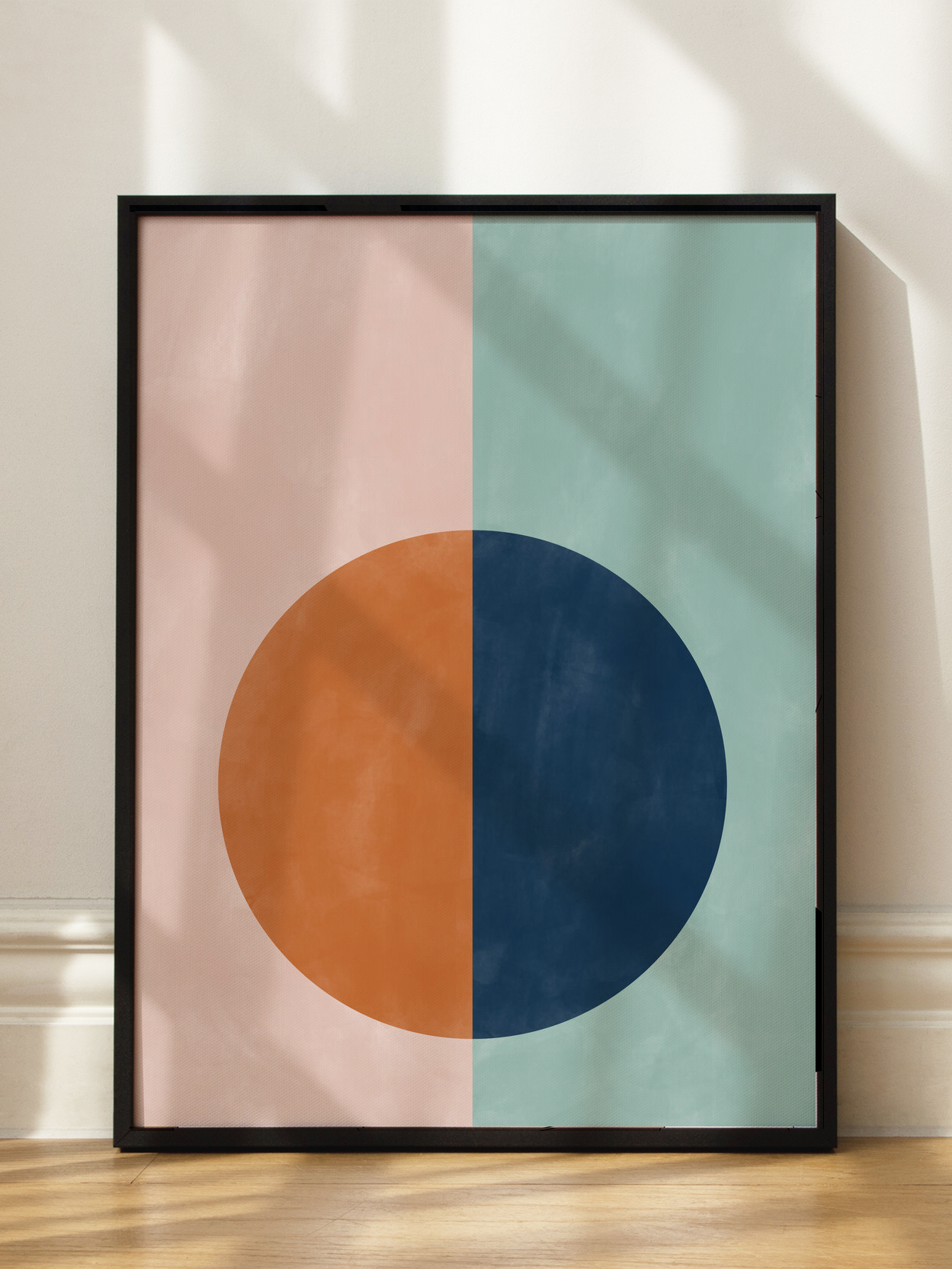 Dieses Poster zeigt eine grafische Komposition mit einem Kreis, der zur Hälfte in Blau und zur anderen Hälfte in Orange gefärbt ist. Der Hintergrund ist zweigeteilt in Rosa und Grün, was einen lebendigen und modernen Look erzeugt. Diese farbenfrohe Darstellung bringt Frische und Trendbewusstsein in jeden Raum.