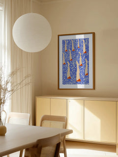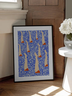 Dieses Poster zeigt eine humorvolle und lebendige Illustration von Schwimmern, die synchron auf dem Kopf im Wasser stehen. Die blauen Wellen und die Beine in roten Badeanzügen schaffen ein dynamisches und verspieltes Bild. Perfekt, um jedem Raum eine fröhliche und kreative Note zu verleihen.