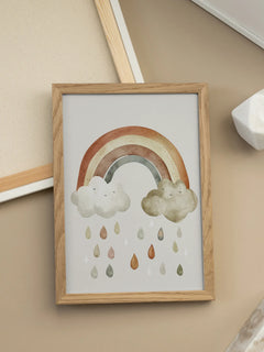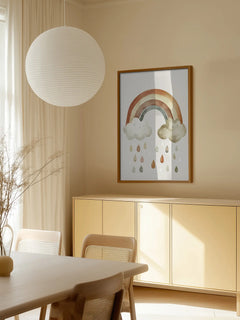 Dieses bezaubernde Poster zeigt eine Illustration eines Regenbogens, der zwischen zwei lächelnden Wolken schwebt, mit Regentropfen, die in erdigen Farben darunter fallen. Der helle Hintergrund verstärkt die sanften, natürlichen Töne des Regenbogens und der Wolken, was dem Bild eine beruhigende und freundliche Ausstrahlung verleiht. Perfekt geeignet für ein Kinderzimmer, um eine fröhliche und einladende Atmosphäre zu schaffen.