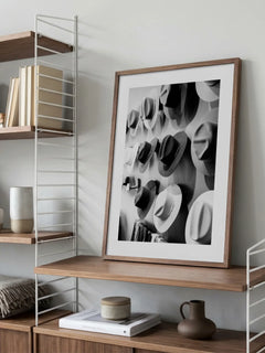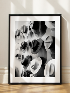 Diese Schwarz-Weiß-Fotografie zeigt eine stilvolle Anordnung von Hüten an einer Wand. Die Mischung aus hellen und dunklen Hüten verleiht dem Bild Tiefe und Struktur. Perfekt für Modefans, die einen Hauch von Eleganz und Vintage-Charme in ihre Einrichtung bringen möchten.