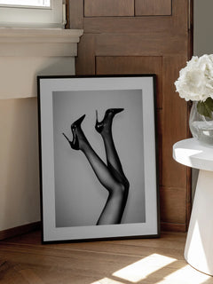 Diese Schwarzweißfotografie zeigt die Beine einer Frau in eleganten Strumpfhosen und schwarzen High Heels. Das Bild strahlt eine zeitlose Eleganz und einen Hauch von Glamour aus, ideal für eine Bilderwand mit Mode- und Fotografie-Postern. Die klare Linienführung und der Kontrast zwischen den schwarzen Schuhen und dem hellen Hintergrund verleihen dem Bild eine moderne und stilvolle Ästhetik.