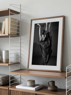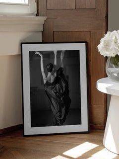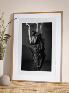 Eine elegante Schwarz-Weiß-Fotografie einer Ballerina in einem fließenden schwarzen Kleid, die anmutig in einem Tanzstudio tanzt. Die Komposition fängt die Schönheit und Präzision des Balletts ein und ist ein ideales Kunstwerk für Liebhaber des Tanzes und der Fotografie. Perfekt, um jedem Raum eine künstlerische und inspirierende Note zu verleihen.