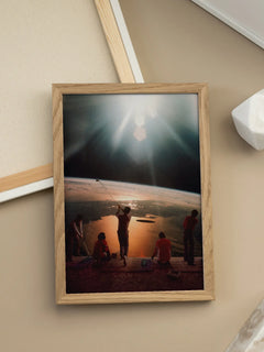 Ein surrealistisches Fotoposter, das eine Gruppe von Menschen zeigt, die auf dem Mond Golf spielen und dabei auf die Erde blicken. Die Szene ist in einem Retro-Stil gehalten und bietet eine einzigartige und faszinierende Wanddekoration. Das Bild kombiniert Elemente von Sport und Weltraum, um eine außergewöhnliche und kreative Darstellung zu schaffen.