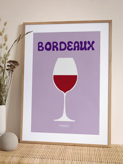 Diese grafische Illustration zeigt ein Bordeaux-Weinglas auf einem lila Hintergrund. Der Text "Bordeaux" ist oben in kräftigen Buchstaben zu sehen, während "France" unten steht. Das Bild verbindet Eleganz und Einfachheit und ist perfekt für Weinliebhaber und Frankreich-Fans.