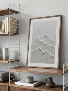 Dieses Poster zeigt eine stilisierte Darstellung von Bergen in einem minimalistischen Design. Die weiße Berglandschaft hebt sich elegant von einem beigen Hintergrund ab und vermittelt ein Gefühl von Ruhe und Gelassenheit. Perfekt, um jedem Raum eine subtile Eleganz zu verleihen.