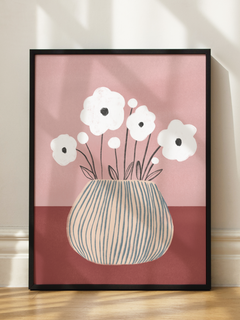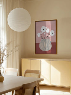 Dieses Poster zeigt eine Illustration einer gestreiften Vase mit weißen Blumen vor einem staubrosa Hintergrund. Die sanften Farben und das minimalistische Design machen es ideal, um einen subtilen Farbakzent in dein Zuhause zu bringen. Perfekt für moderne und stilvolle Inneneinrichtungen.