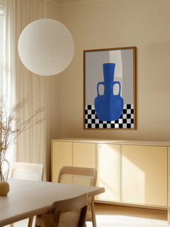 Dieses kreative Poster zeigt eine Illustration einer blauen Vase, die auf einem schwarz-weiß karierten Tisch steht. Der Hintergrund ist in einem sanften Beigeton gehalten, was einen modernen und trendigen Look erzeugt. Die kräftige blaue Farbe der Vase bildet einen auffälligen Kontrast zu den neutralen Tönen des Hintergrunds und des Tisches. Dieses Kunstwerk eignet sich perfekt, um jedem Raum einen Hauch von zeitgenössischem Stil zu verleihen.