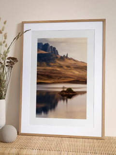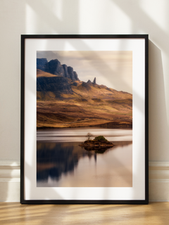 Diese beeindruckende Fotografie zeigt einen ruhigen See mit einer kleinen Insel im Vordergrund und einem majestätischen Berg im Hintergrund. Die sanften Farben und die friedliche Landschaft der Isle of Skye bringen eine beruhigende Atmosphäre in jeden Raum. Perfekt für Naturliebhaber und alle, die ein Stück schottische Wildnis in ihr Zuhause holen möchten.